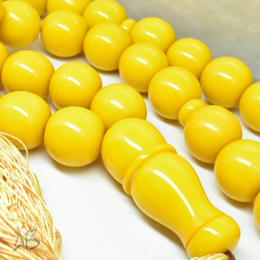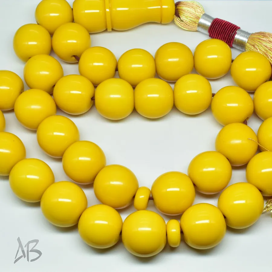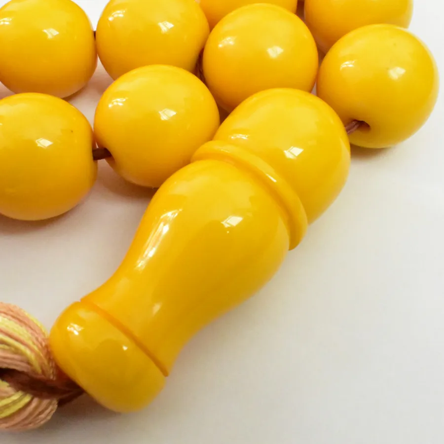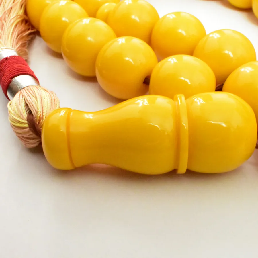 مهرههای تسبیح سندلوس در گذشتههای بسیار دور از صمغ شفاف و زرد رنگ نوعی درخت ساخته میشد. در حال حاضر بسیار بعید است که بتوان تسبیحی با این ویژگیها پیدا کرد و تمام تسبیحهای سندلوس اصل بودار موجود در بازار، اعم از آلمانی یا غیر آلمانی (کهنه یا جدید) از نوعی رزین مصنوعی ساخته شدهاند.