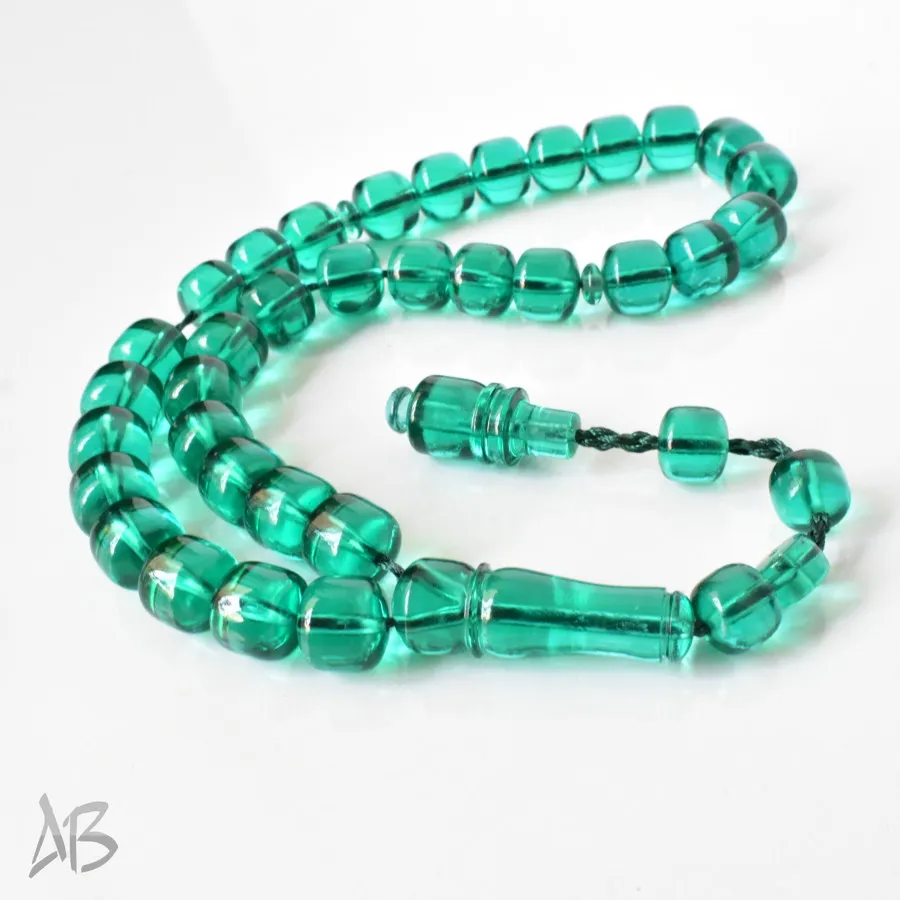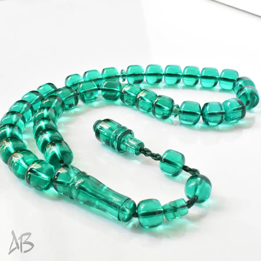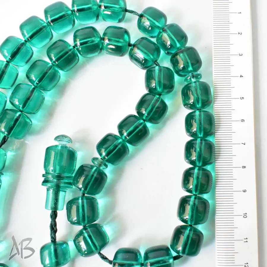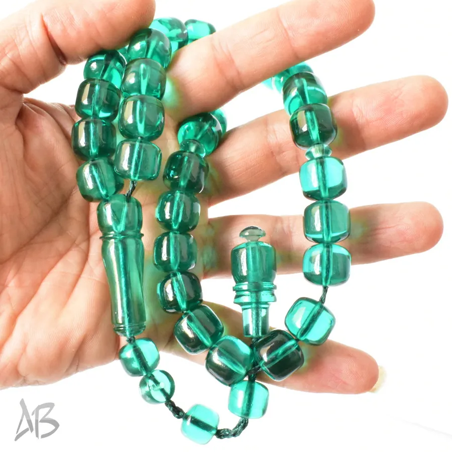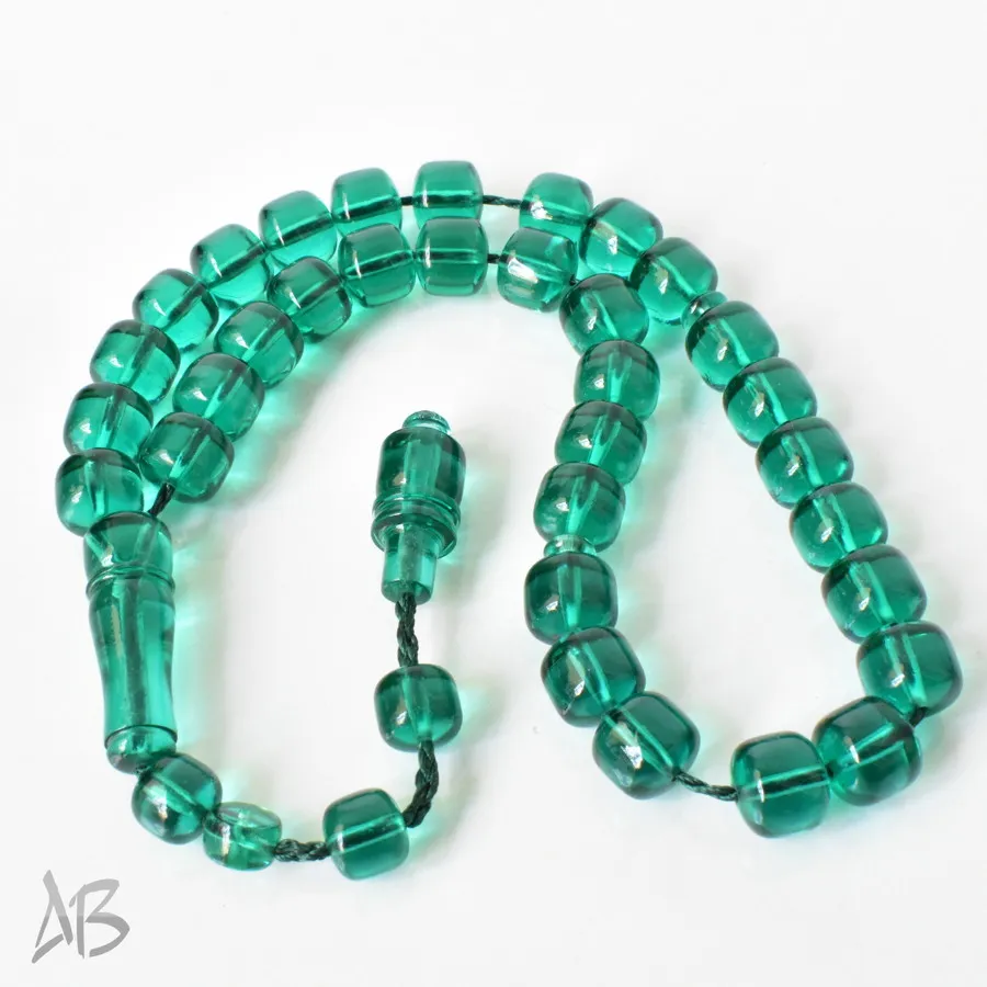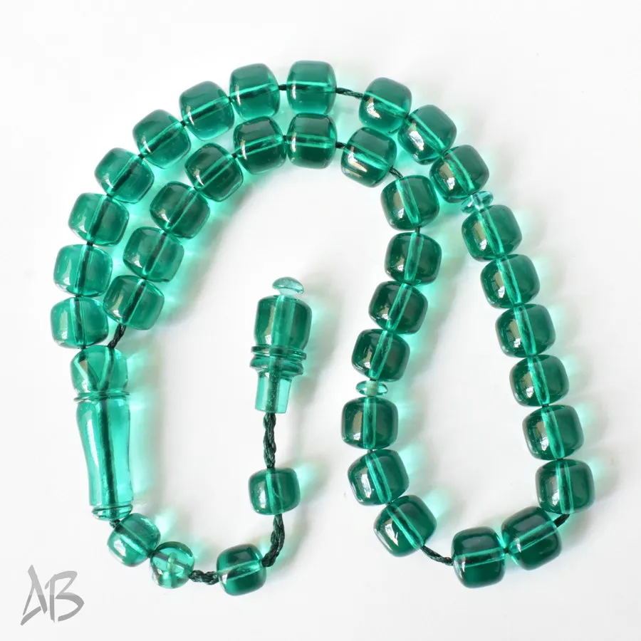 تسبیح سندلوس بودار 33 دانه اصل کد 1297 قپاندار استوانهای لبه گرد سبزآبی خوشرنگ آقابزرگ