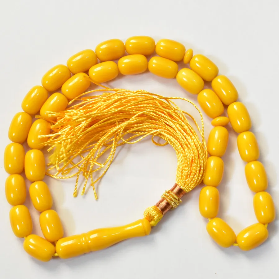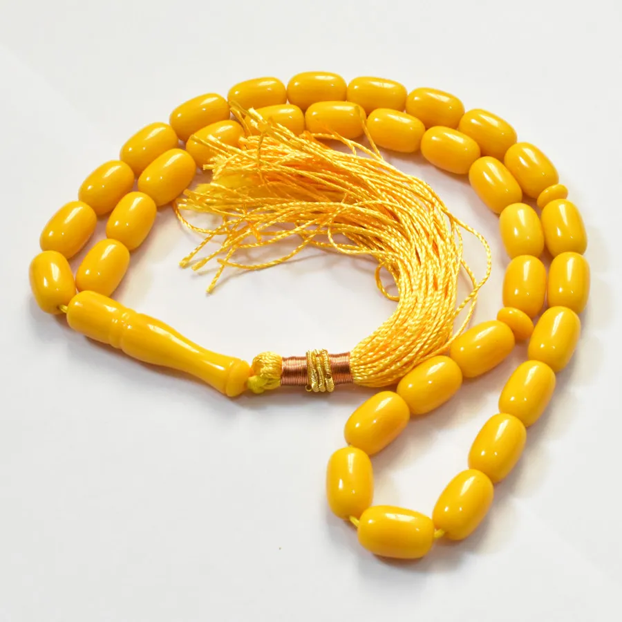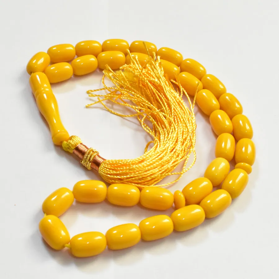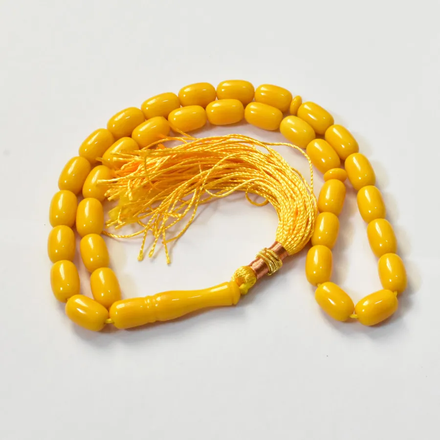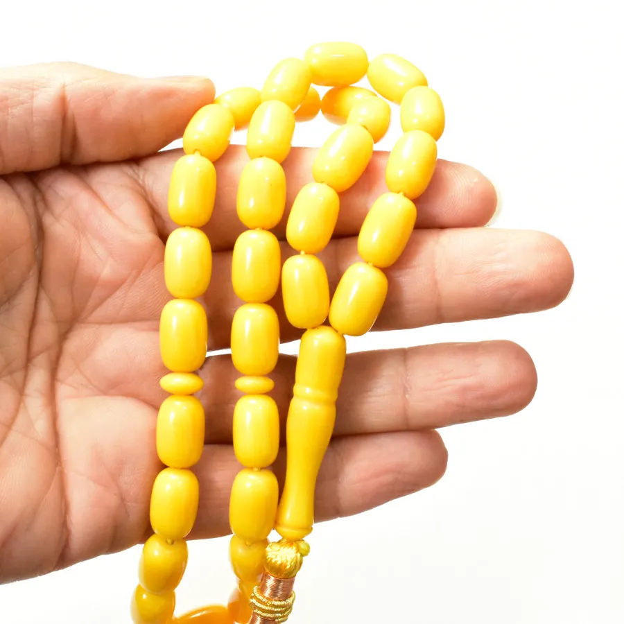 تسبیح سندلوس 33 دانه بودار کد 1335 تراش کپسولی کشیده زرد بسیار درخشان و زیبا آقابزرگ